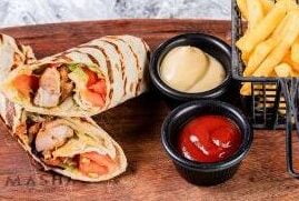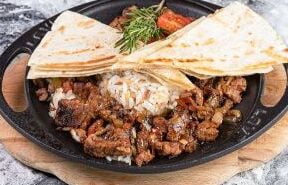 €23.50Kebab ingerold in lavasbrood met tomatensaus, roomboter en Turkse yoghurt. Geserveerd met bulgur