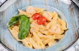 €16.50Pasta met garnalen, ui, knoflook en roomsaus