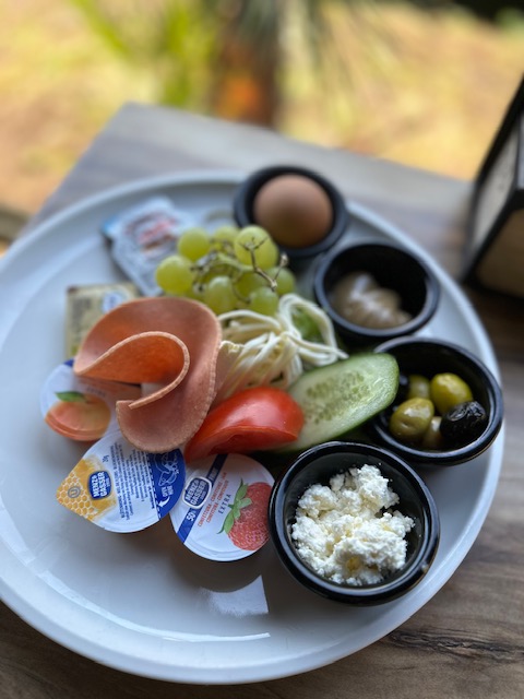 €13.95kaas, ei, jam, salami, boter, olijven, honing, tomatan, komkommer en thee